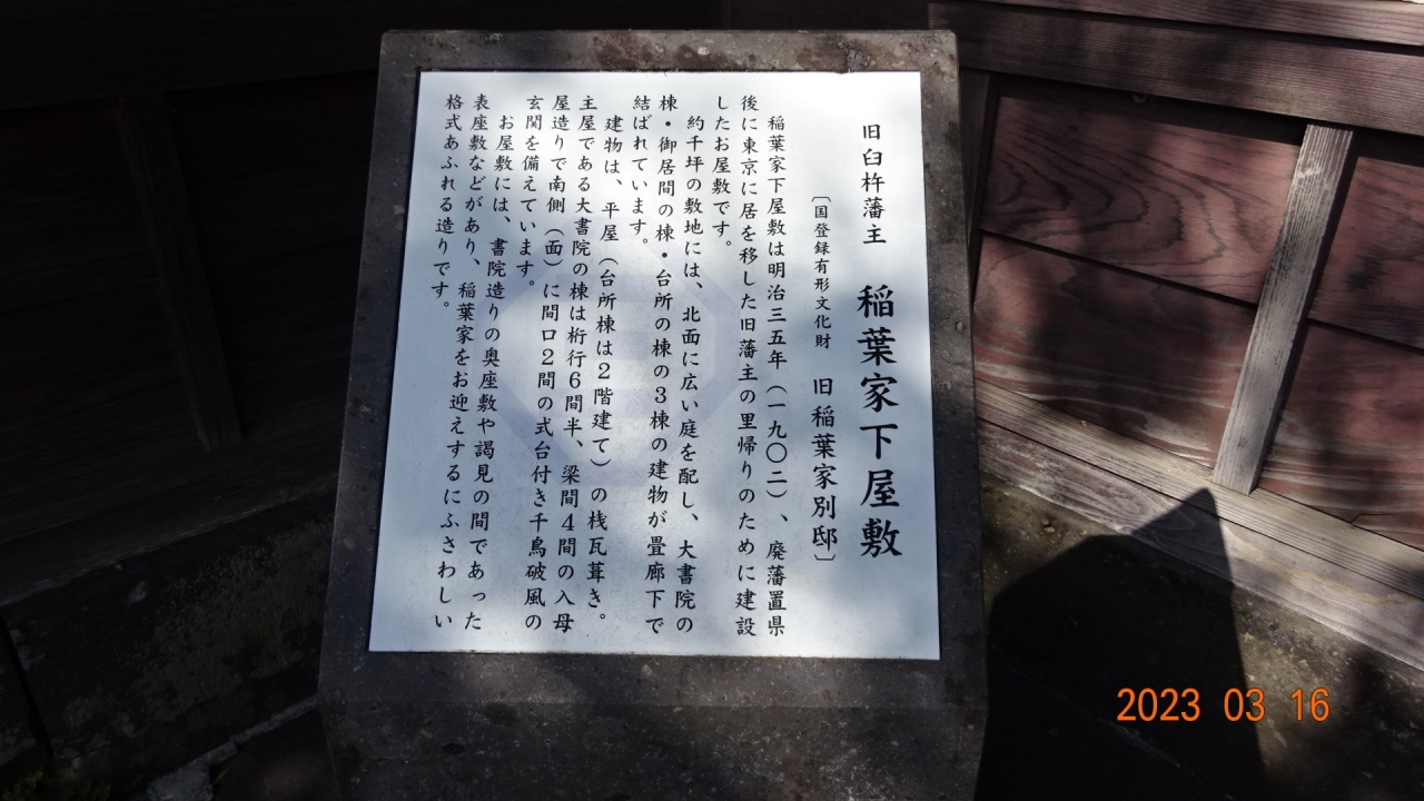 二つのお屋敷を見学できます。帰りの電車の時間が迫っていたので、かなり慌ただしくお屋敷内を見て回りました。「稲葉家下屋敷」から「旧平井家住宅」に行くときは、縁側でサンダルに履き替えて移動しました。慌ただしかったのですが、見学者が私一人だったので、ぜいたくな時間が過ごせました。