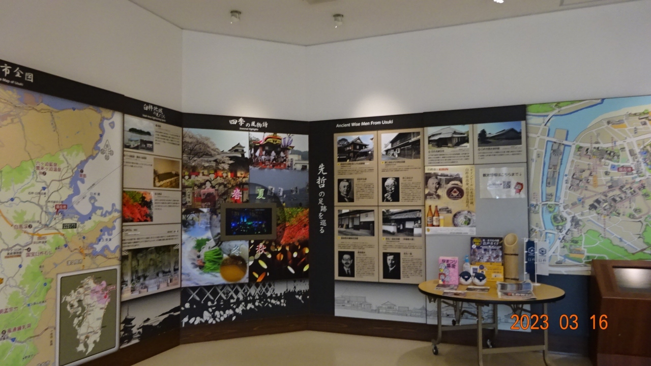 大きなパネルに臼杵市のマップや観光情報が展示してありました。観光パンフレットも複数置いてありました。スタッフの方もいらっしゃいます。- 旅行時期