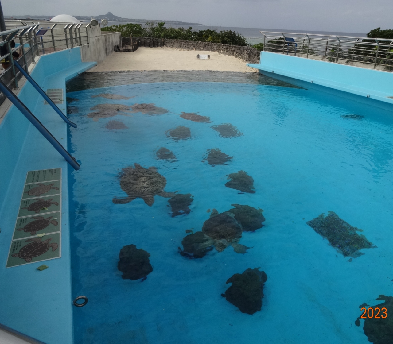 水槽の中でウミガメがたくさん泳いでいました。水槽の上からも見ることができるのですが、階段を降りて、建物の中に入ると、水槽の横からガラス越しに見ることもできます。- 旅行時期