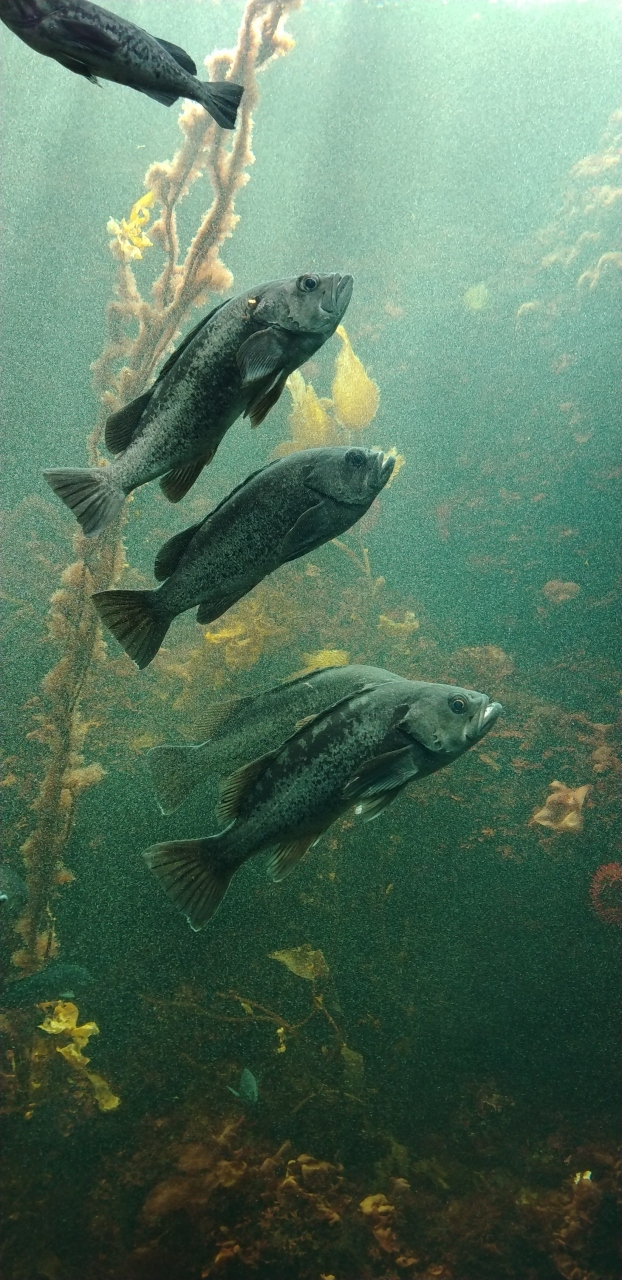 巨大な水槽の中を、大きな魚、小さな魚がゆったりと泳いでいます。
