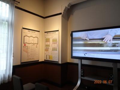 中に入るとすぐ左手に、文化財保存修復工房といった雰囲気のお部屋があって、椅子に座って、様々な修復工事の行程のビデオを上映していました。