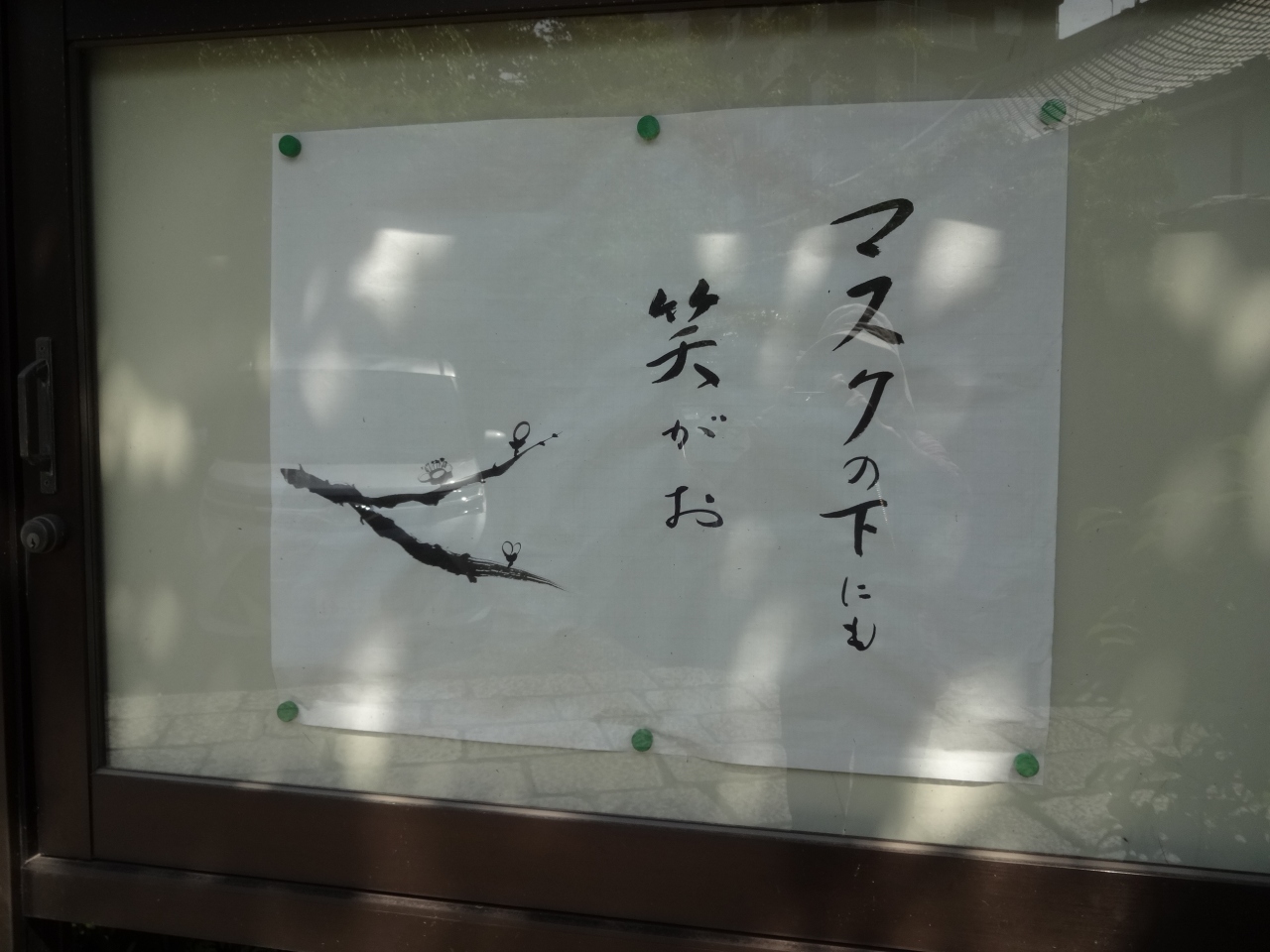 こちらの門の近くの掲示板に、「マスクの下にも笑顔」と書かれていました。