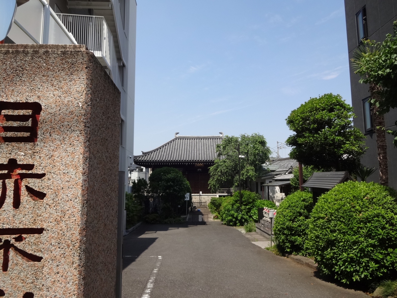 本郷通り沿いに門があって、そばに石造りのお地蔵さまがあります。マンションや住宅の間にある細い通りを西に進むと本堂がありました。大きな寺院ではありません。