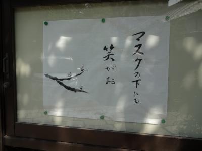 • 門の近くの掲示板に、「マスクの下にも笑顔」と書かれていました。