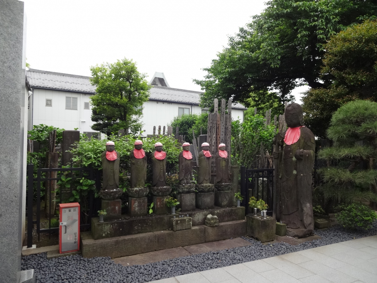 門を入ってすぐ左手に、赤いよだれかけ(?)を掛けたお地蔵さまが並んでいました。
