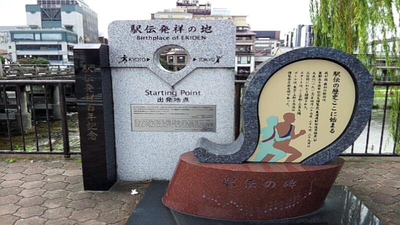 鴨川沿いの遊歩道に、真新しい「駅伝発祥の地」のモニュメントがありました。出発地点が、この場所だったようです。意外と目立つモニュメントだったのですが、ここで足を停めたり、このモニュメントを見るような人はいませんでした。