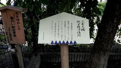 西側です。古そうな石の柱と説明版の駒板がありました。石柱は歴史ある雰囲気でしたが、説明版は、まだ新しそうな印象を受けました。昔の三条大橋で使われた石を、新しい橋のたもとに置いているようです。