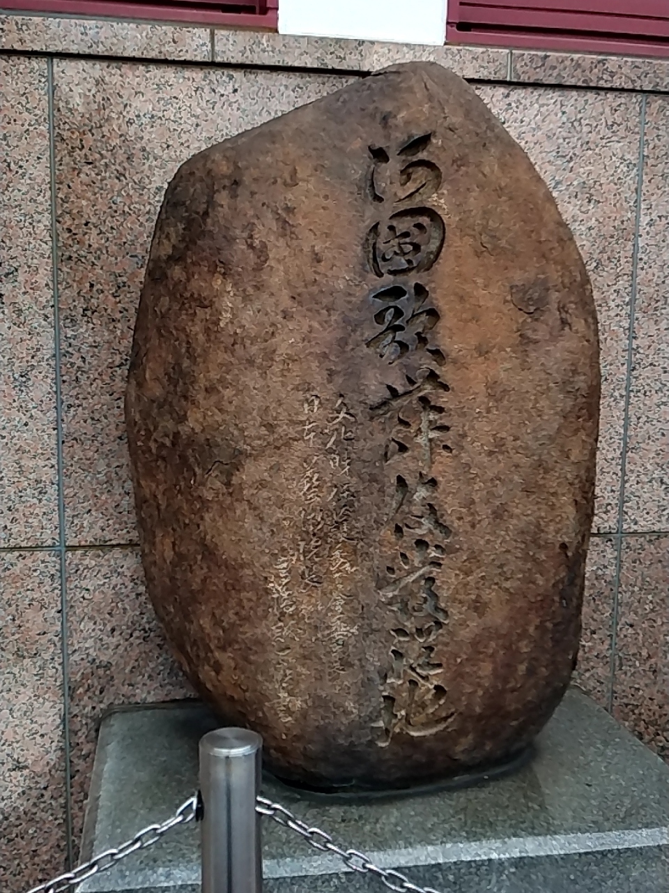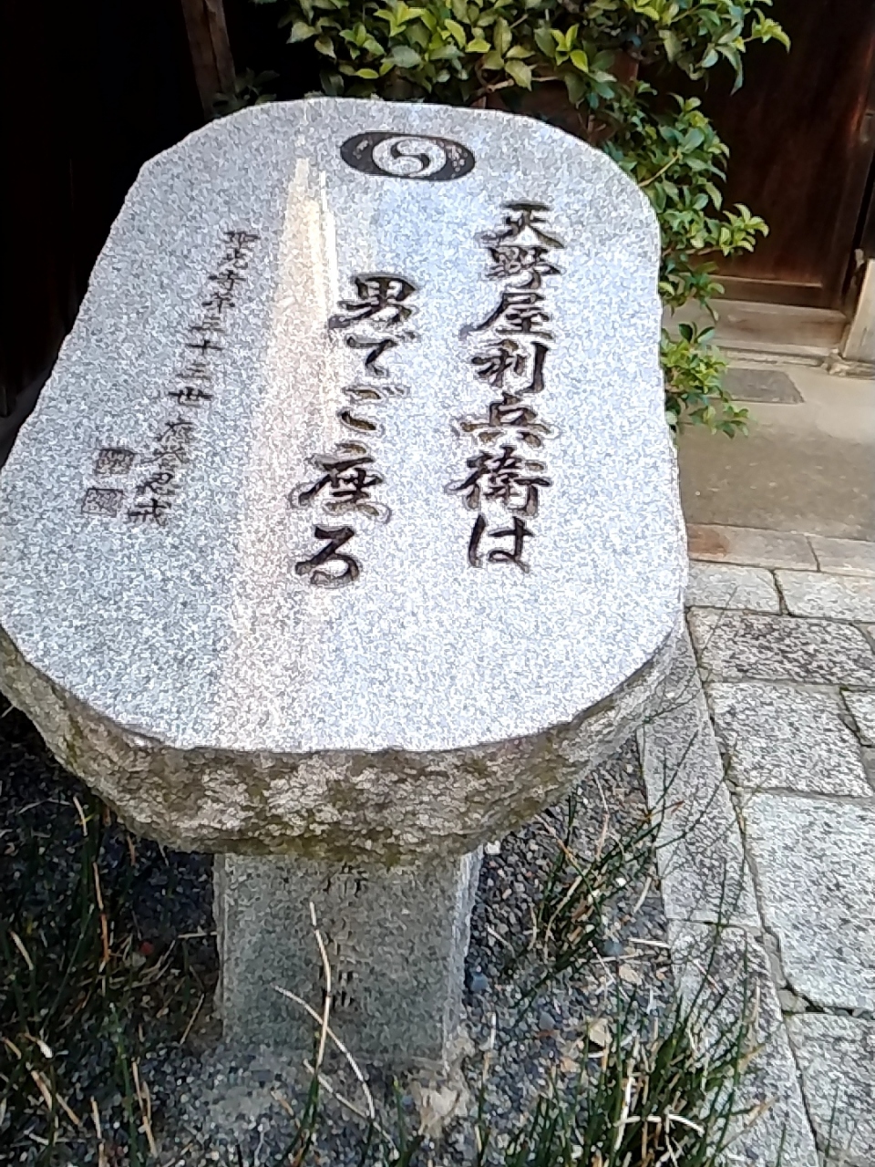 門の外に「天野屋利兵衛は男でござる」という石碑がありました。