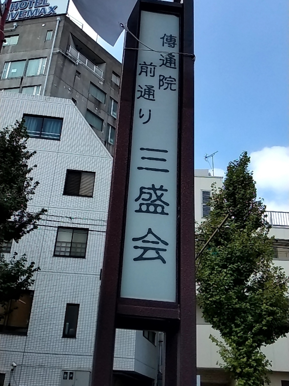 • 伝通院の前の大通りの歩道の両脇に、「伝通院前通り三盛会」という立派な表示がありました。