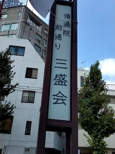 伝通院の前の大通りの歩道の両脇に、「伝通院前通り三盛会」という立派な表示がありました。