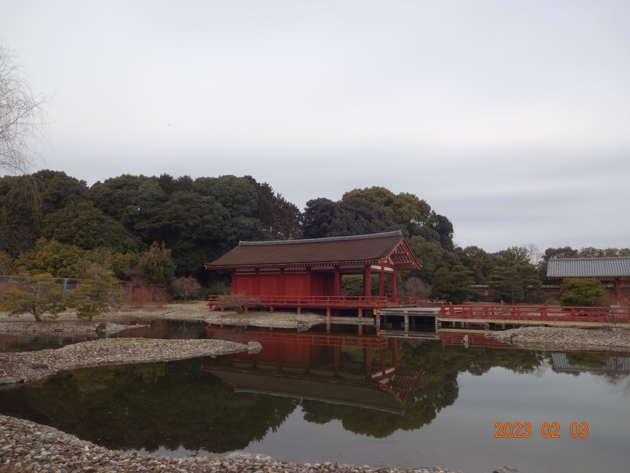 自転車で散策していたので、東院庭園の自転車置き場に自転車を置いて歩いていきました。うっそうとした雰囲気です。晴れている日だったのですが、木立で薄暗いです。- 旅行時期