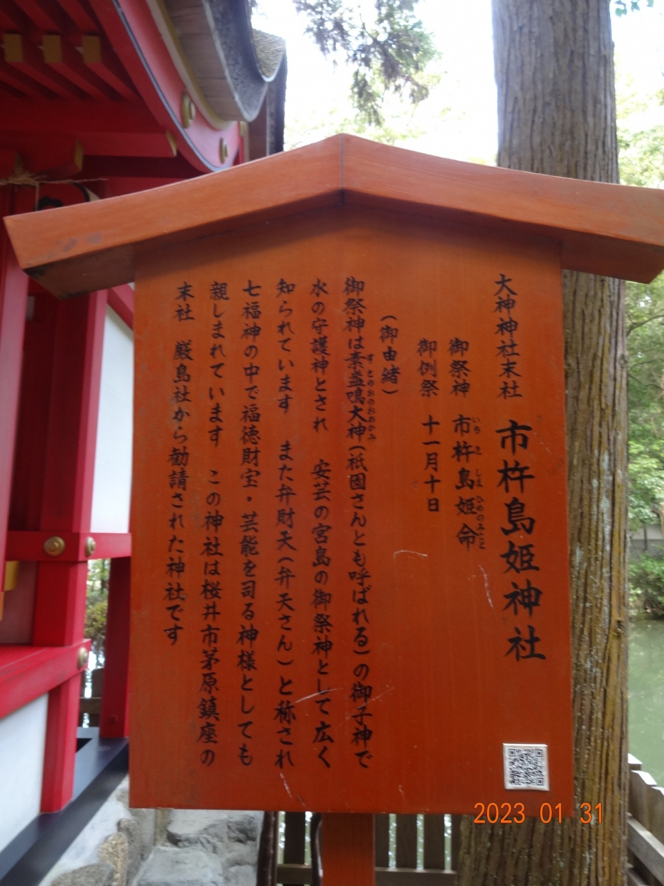 九州の宗像の神様で、市杵島姫命をお祀りしているそうです。海の神、水の神で、芸能をつかさどる弁天さんとしても親しまれているそうです。- 旅行時期