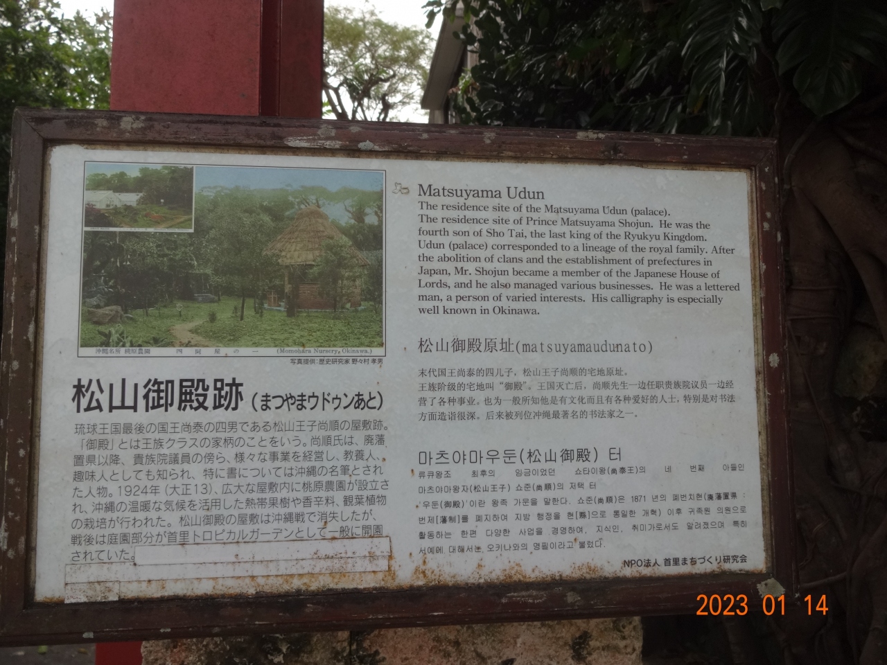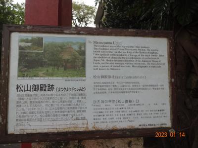 大きな建物の門の前に、「松山御殿跡」という表示がありました。