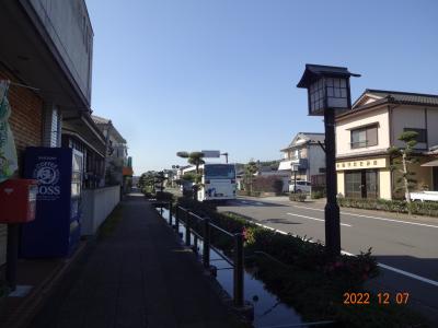 知覧武家屋敷入口のバス停で下車。そのバス通りにありました。23号線です。道路わきにある細長いお濠を見てみたら、魚が泳いでいるのです!驚きました。バス通りといっても、交通量はそれほど多くはありませんでした。- 旅行時期