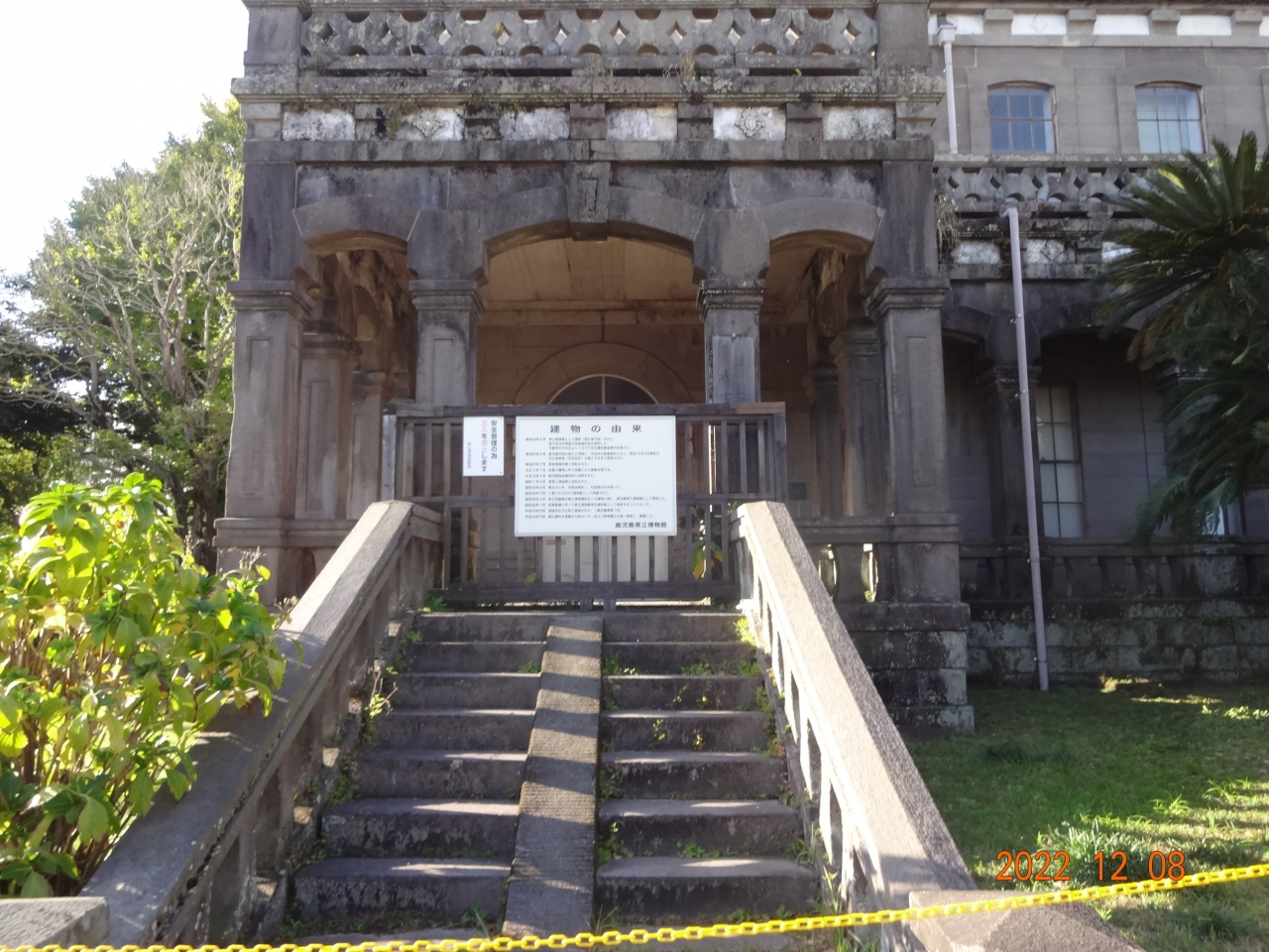 広場で遊んでいる高校生らしき年頃の男の子たちがいました。建物の周辺にはロープが張られて、中に入ることはできません。入口付近に「建物の由来」に関する案内表示がありました。興業館として建設された鹿児島ならではの石造建築なのだそうです。- 旅行時期