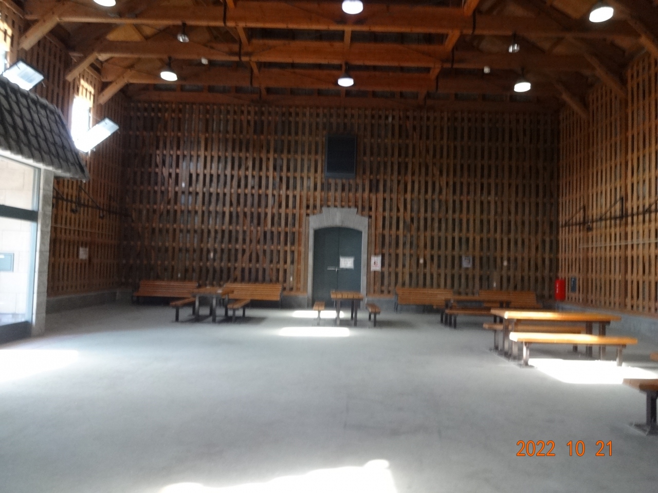 天井が高い広々した倉庫の中には、椅子とテーブルが、いくつか設置されています。倉庫の中を巡回しているスタッフの方もいらっしゃるようです。- 旅行時期