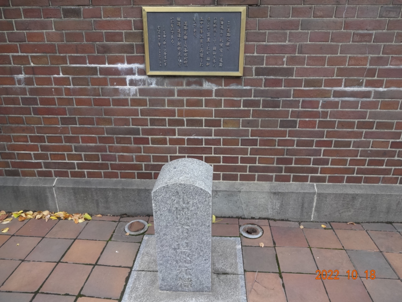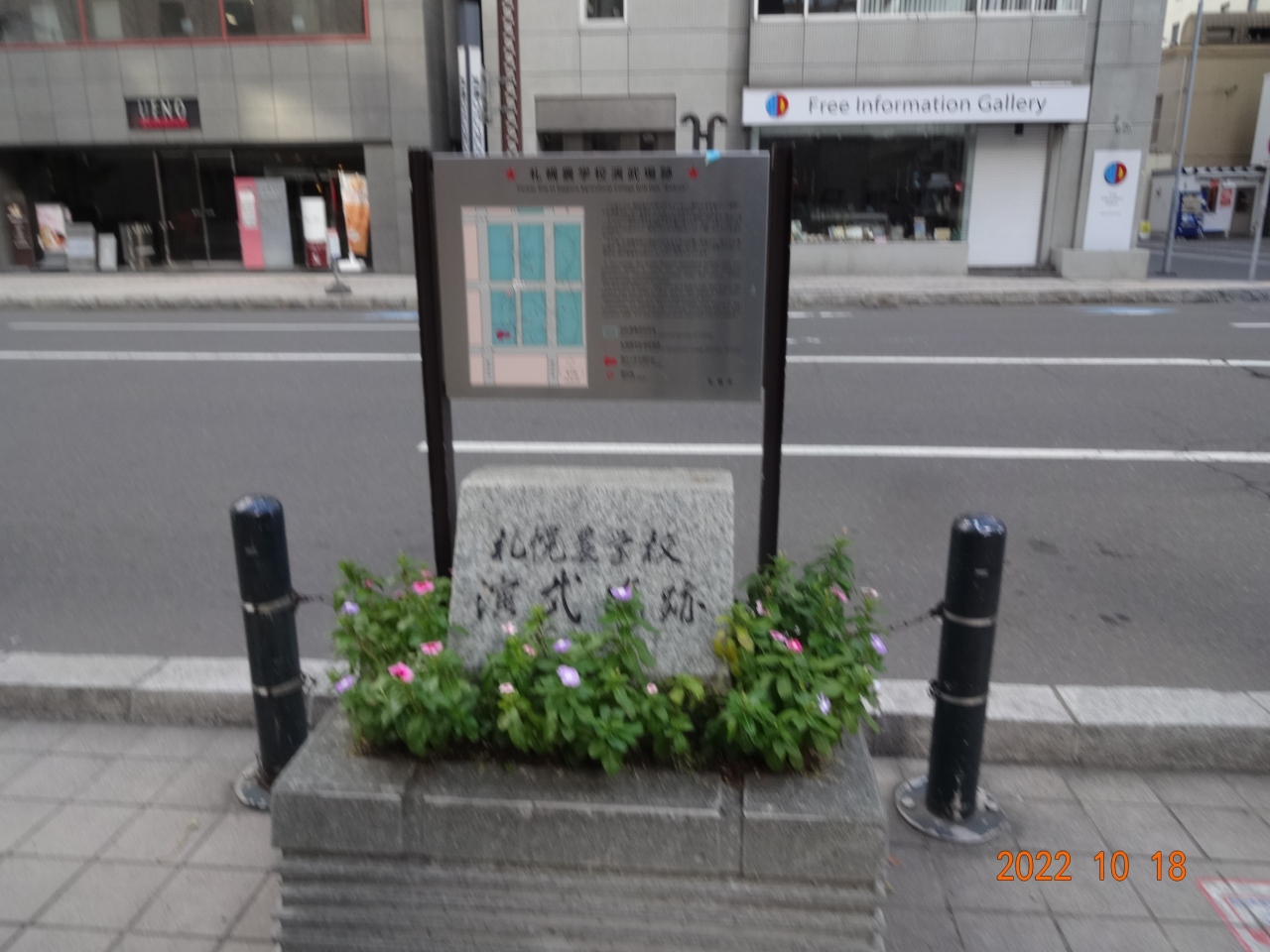 通りの歩道の道路側に、「この場所に、札幌農学校の演武場があった」という表示がありました。