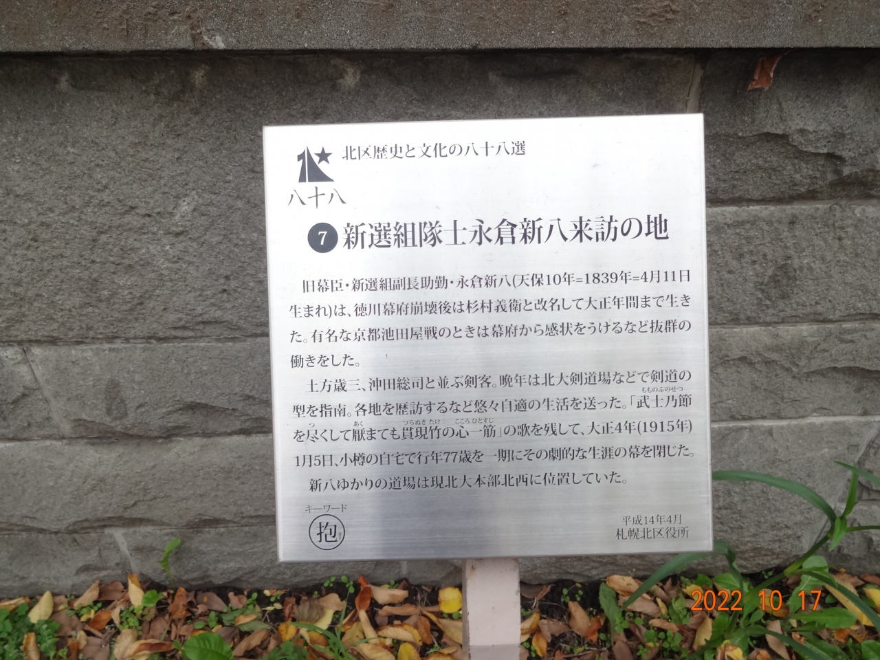 その表示の前の歩道には、新選組の誠の文字が書かれたタイルがあるのですが、この時期は周辺の落ち葉で覆われ、分かりにくかったです。人通りの多い場所ですが、この表示に目を止める方は少ないのかもしれません。- 旅行時期
