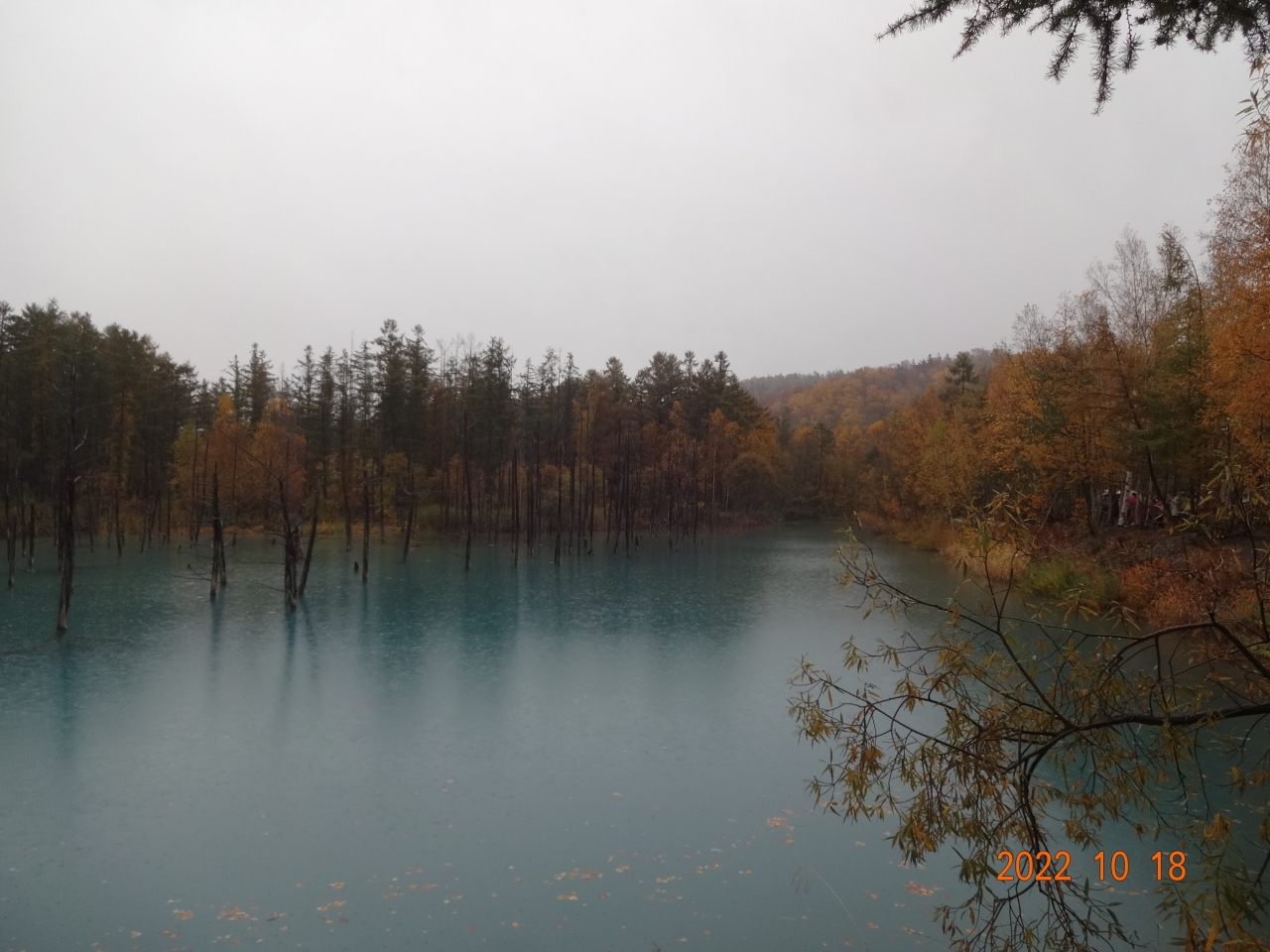 天候は雨で、大雨ではないのですが、小雨が続く状態の中、青い池の周りを歩きました。