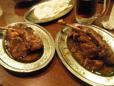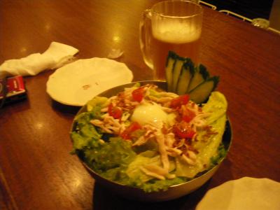 お目当ては何といっても骨付鶏。しっかりと下味が付けられた骨付鶏は肉がしっかりと締まっていて、噛めば噛むほど旨味がじゅわ~っと染み出してきます。これにビールをぐいっと呑めば、爽快間違いなし。料理の味付けは濃いめなので、サラダや付け合わせのキャベツとバランスよく食べるのが吉です。