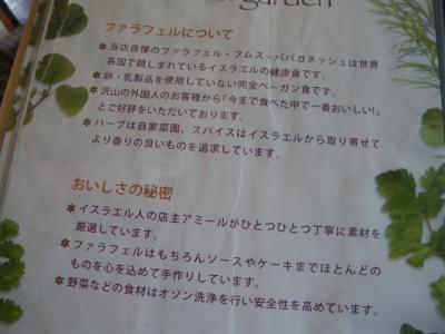京都に住んでいた頃、友人に紹介してもらってよく行っていました。観光客の方にとってはアクセスが大変(レンタサイクルで行くのがよいかも)ですが、行く価値あり。ピタパン専門店で、色々な種類がありますが、一番のおすすめはひよこ豆のピタパンです。豆とお肉、たっぷりの野菜がもっちりとしたピタパンの生地によく合います。ペロッと2個はいけると思います。次はいつ行けるかなぁ。。