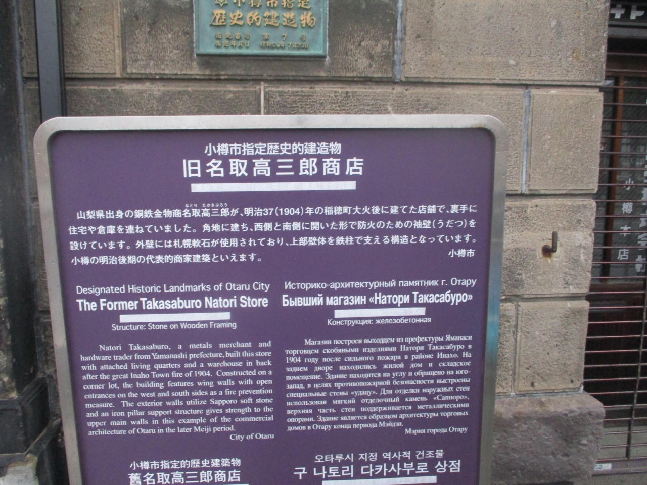 堺町通りから続く色内通りが北のウォール街といわれた日銀通りと交差する角地に建っています。白っぽい外壁のコンクリートのあまり特徴のない建物ですが、小樽市の歴史的建造物に指定されています。現在は、洋服工場として利用されているようです。