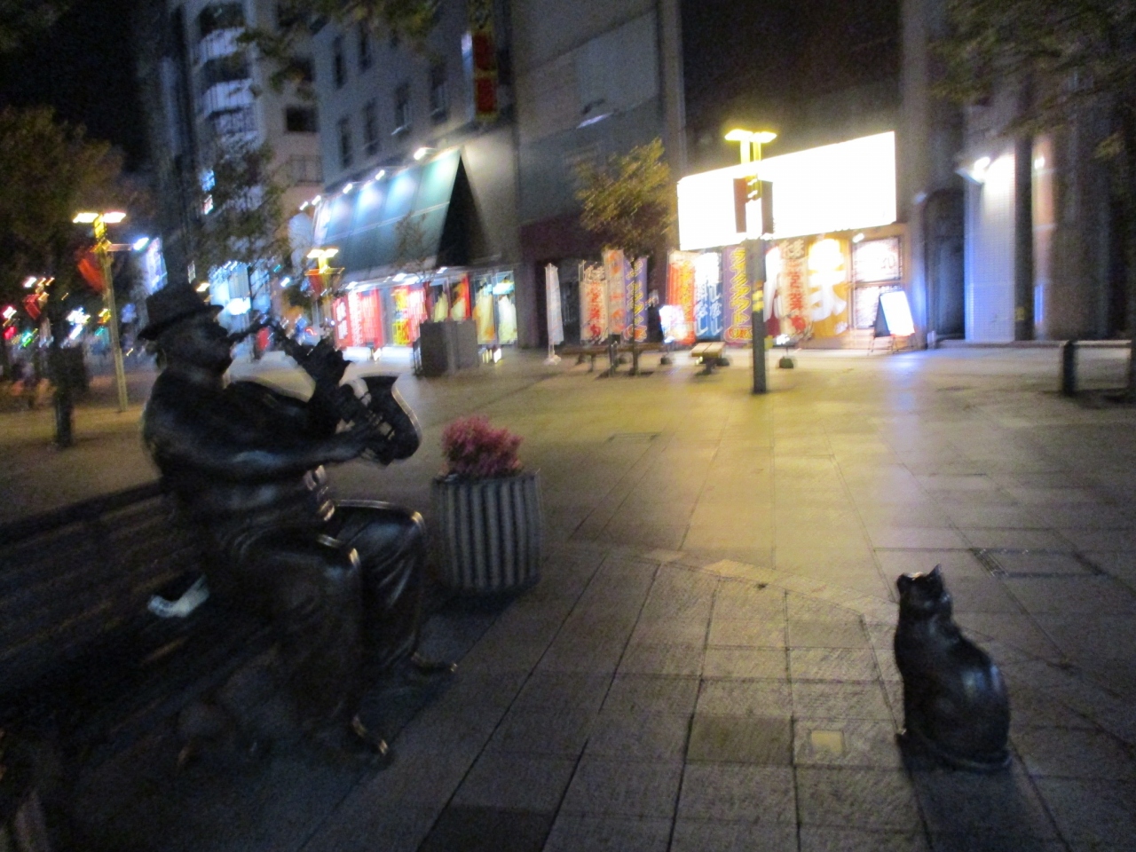旭川平和通り買物公園の途中にあります。彫刻家黒川晃彦氏の作品で、サキソフォンを吹く男性の前に猫が座り、その演奏を聴いているというブロンズ像です。とてもユニークなブロンズ像で、この通りを歩いていて、思わず足を止めてしまいます。