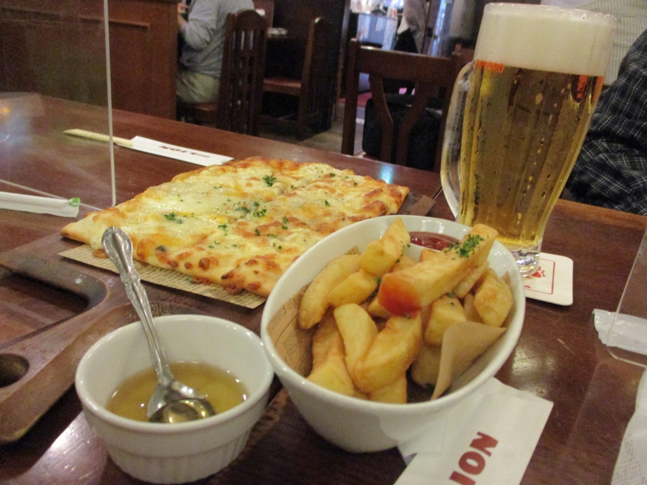 ファクトリーのビアケラー開拓使が改装中、札幌駅パセオのライオンが営業終了してしまい、札幌でサッポロの「生」を楽しめる数少ないビアレストランです。今回は、滞在中、2日続けて訪れました。店内は、思ったより狭く、2日とも、とても混雑し、待って入店できました。生ビールと、ミックスピザと、フライドポテト、ジンギスカンを注文し、とてもおいしくいただきました。