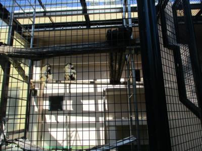 動物園正面入り口を入ってすぐのところにあります。鉄骨金網づくりの大きなケージの中にオオワシなどのワシ類とフクロウなどがいました。ケージの中には、止まり木や巣や池などが設けられていますが、大きな猛禽類にとっては、少し手狭であまり自由に飛び回れないようです。