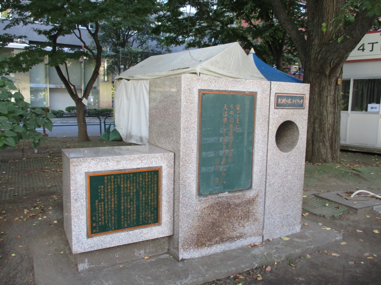 大通り公園西4丁目にあります。四角い歌碑の中に歌が刻まれており、吉井勇が旅先の札幌で詠んだ歌だそうです。正直、吉井勇という歌人のことはこの碑で初めて知りました。ライラックは、札幌の木とされており、初夏に美しい花をさかせ、札幌の人々に親しまれている木のようです。
