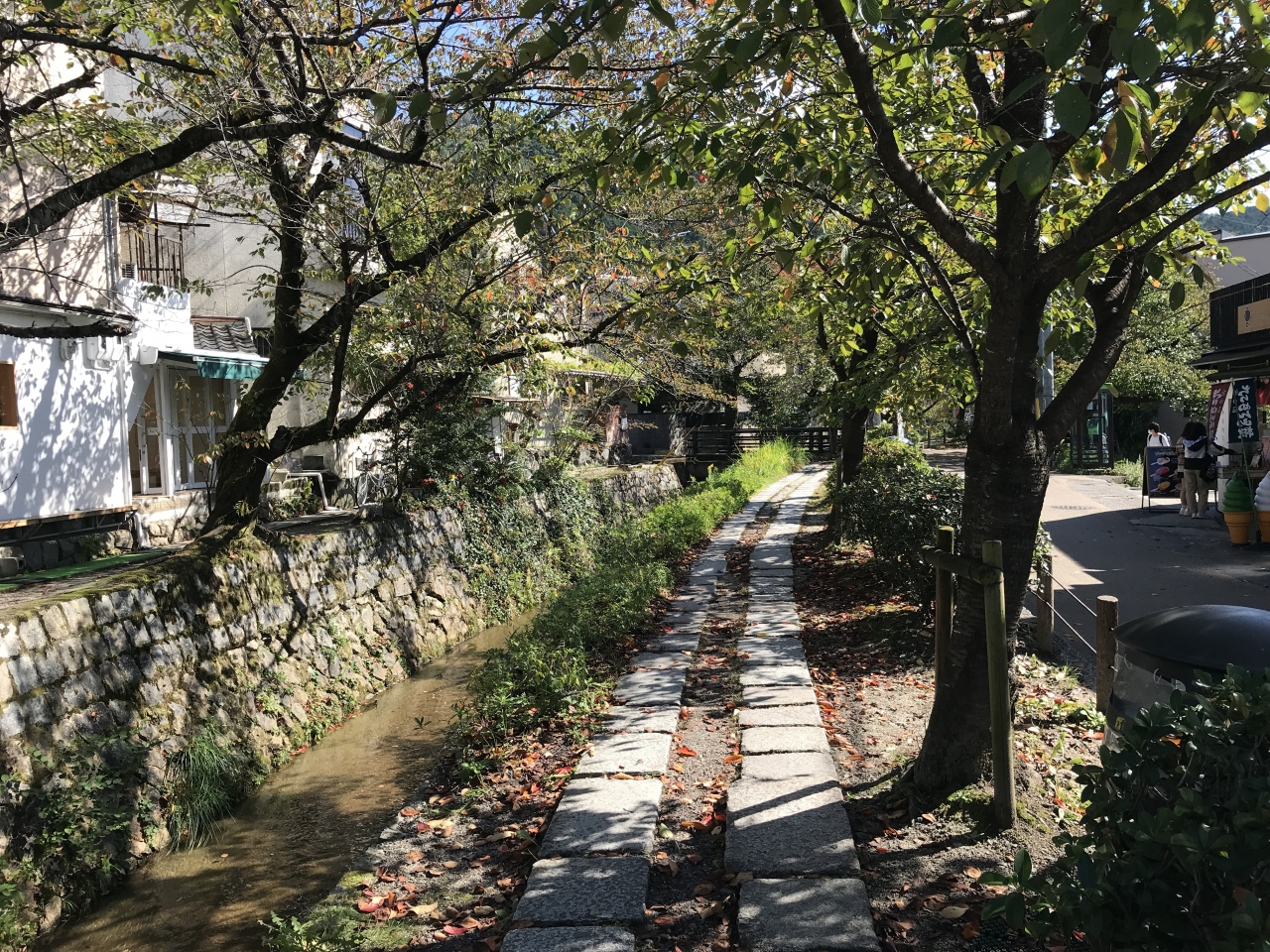 京都市街の東部、銀閣寺付近から、南禅寺近くまで続く遊歩道です。疎水にそってもうけられた遊歩道は、かつて西田幾多郎が毎朝ここをさんぽしたことから、哲学の道と呼ばれるようになったそうです。とても良い雰囲気の遊歩道で、何度来ても飽きることはありません。この哲学の道に並行して道路が走っていますが、喫茶店や土産物店などが並び、観光客が行きかっています。