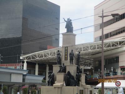 鹿児島中央駅東口広場前にたっています。幕末に薩摩藩がイギリスへ派遣した若き留学生たちの像です。イギリスで多くの技術や知識を習得した彼らは帰国後、日本の近代化に大きな貢献をしました。鹿児島市50万都市達成を記念して製作されたそうです。
