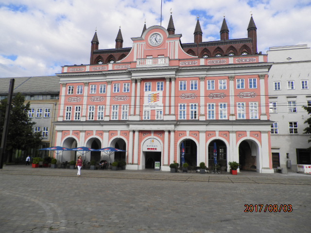 ロストックのノイアーマルクト広場に面して建つ堂々とした市庁舎です。市庁舎前をトラムが走り、トラムの停留所もあります。かつては、レンガ造りであったものが、18世紀にバロックの様式に建て替えられたそうです。現在は、淡いピンク色の外観が印象的で、地下には、ラーツケラーも設けられていました。