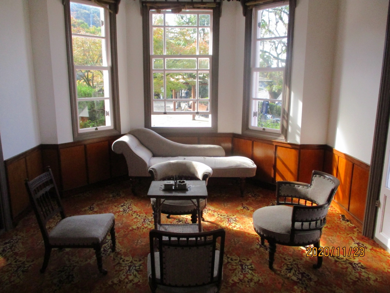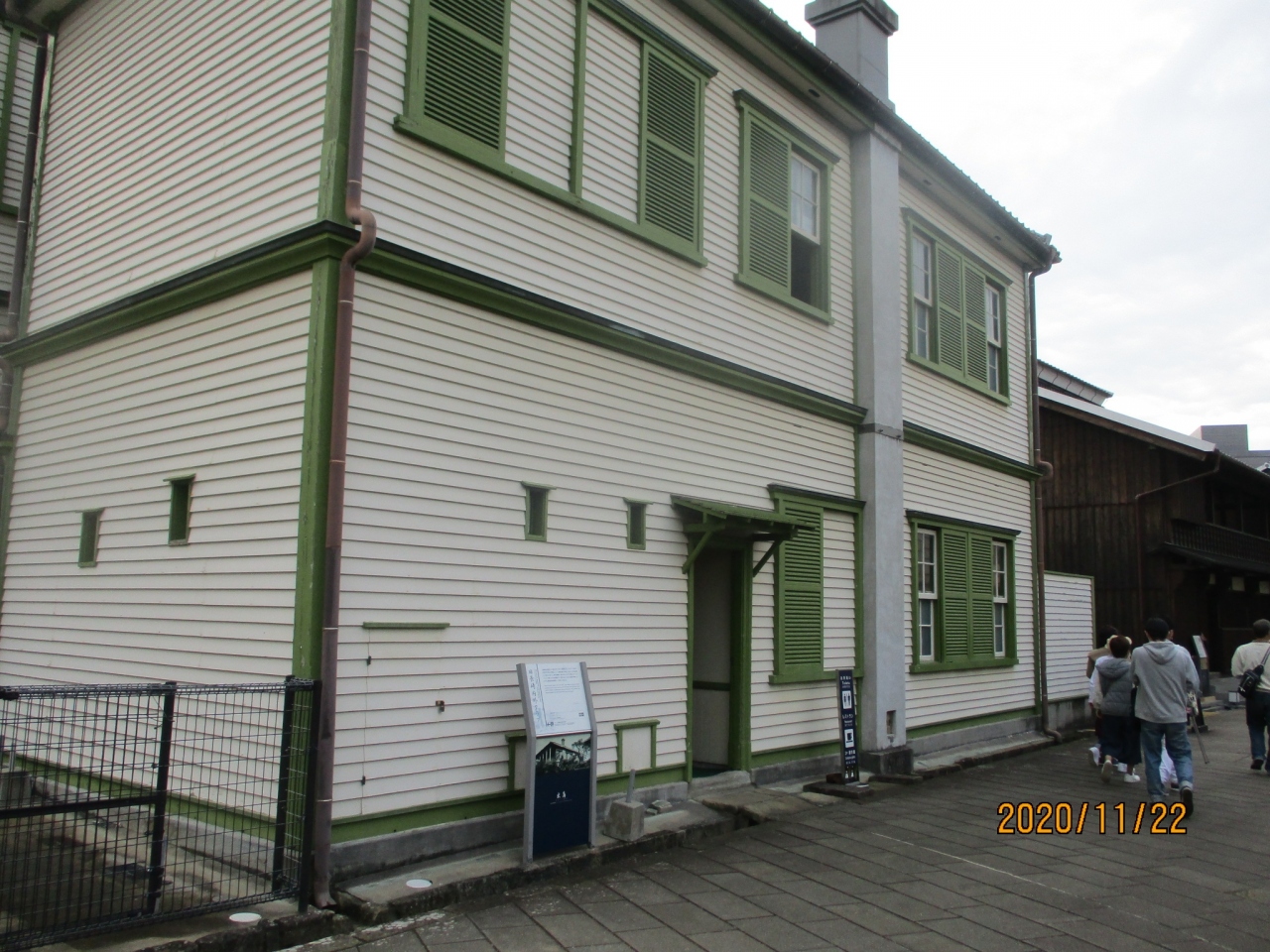 グラバー園全体の中ほどにたっている洋館です。イギリス商人ロバート二-ルウォーカーの次男が明治時代に暮らしていた住宅です。建物は木造平屋建てで、とてもシンプルな感じがしました。建物内には、テーブル、いす、ソファーなどがおかれた当時の居室が再現されていました。