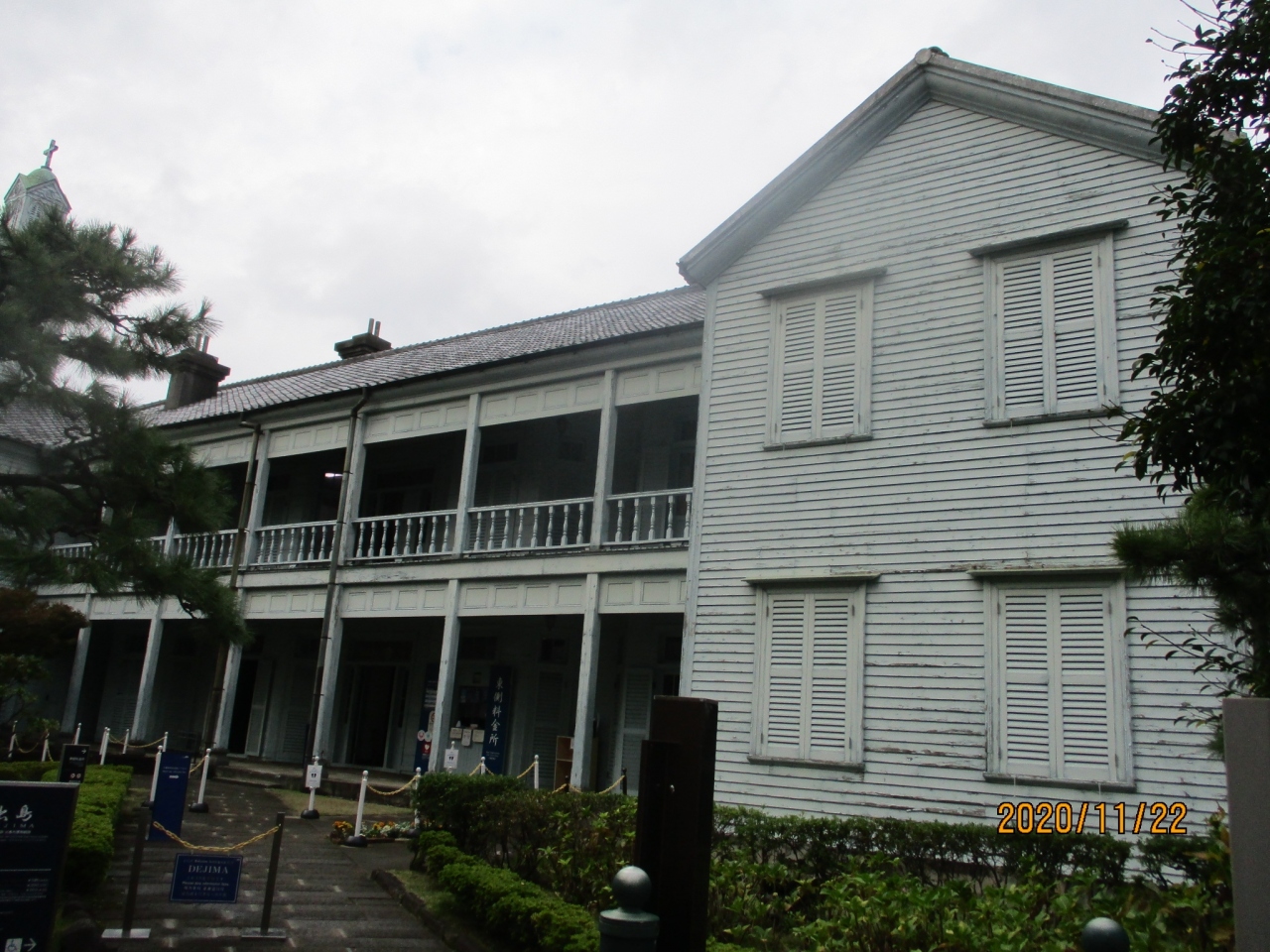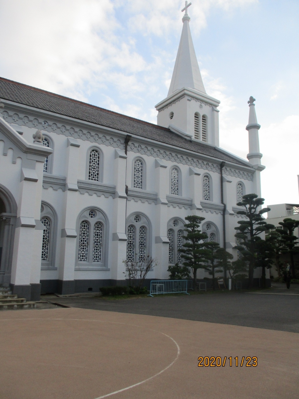 福済寺から、長崎歴史文化博物館にむけて歩いているとき、偶然、通りかかりました。尖塔をそなえた美しい教会です。もともと、この教会は、19世紀末に日本人のために日本人神父によって建てられたものでしたが、1945年の原爆によって外壁と尖塔を残して焼失しました。その後、再建され、現在の姿となっており、長崎市の被爆遺構に指定されています。