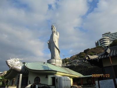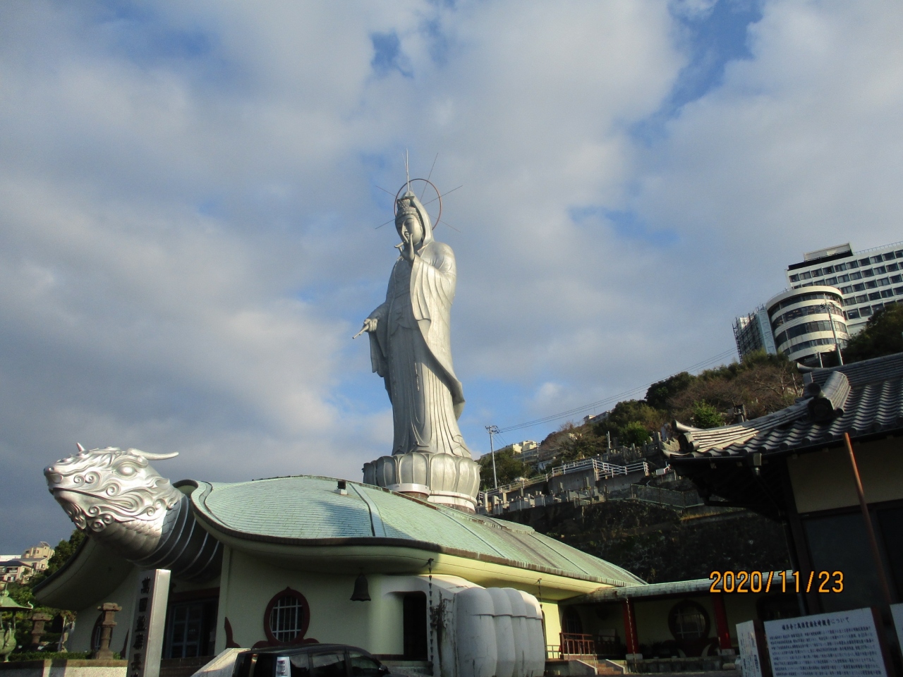 JR長崎駅前から、東へ徒歩約10分ほど坂を上っていったところにあります。被爆者と戦没者の霊をなぐさめるために作られた長崎観音が亀の形をした台座の上にたっています。もともとは、長崎でも由緒ある重要な唐寺だったそうですが、被爆により、その面影は失われてしまっています。