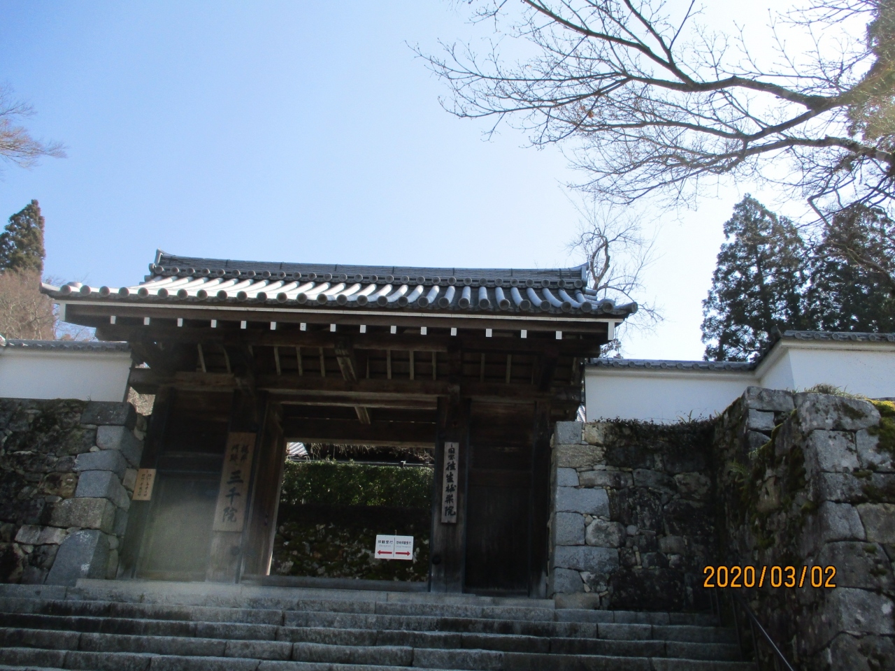 三千院の風格ある山門で、山門横には石垣が築かれ、堅牢な印象をあたえています。門をくぐって左手に行くと、客殿、宸殿への入り口があり、右手は円融蔵(宝物館)方面へ通じています。山門横の石垣は、自然石を組み合わせたもので、坂本の穴太衆によって築かれたそうです。