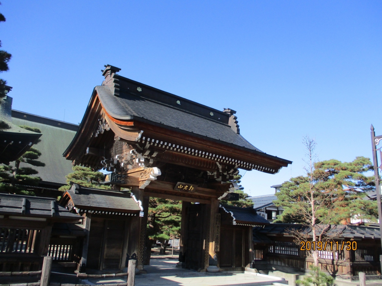 JR飛騨古川駅の西側、瀬戸川と白壁土蔵群に隣接して建っています。浄土真宗の古刹で、毎年1月にこの地で行われる『三寺まいり』で詣でる寺のひとつです。本堂屋根下には、明治時代の大火のおり、火災からこの寺を守ったとされる『水呼びの亀』といわれる亀の彫り物があります。。また、山門は戦国時代の武将、金森氏が築城した増島城の城門を移築したもので、寺の裏には、若山牧水水の歌碑もあります。