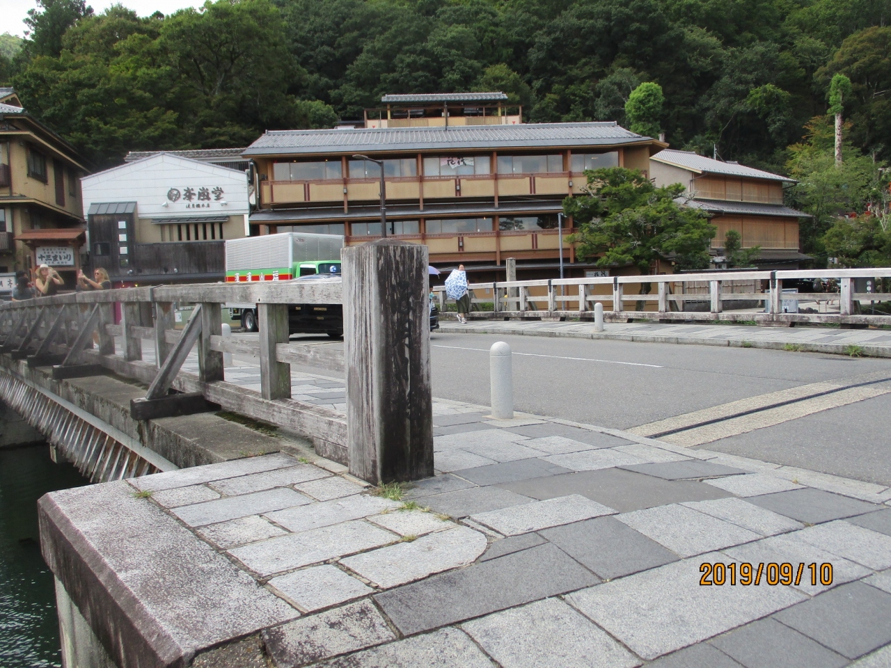 観光地嵐山を代表する建造物。桂川にかかる2車線の道路で、外側に歩道が設けられ、木の欄干がつけられている。日中は、あまりにも多くの観光客が訪れ、非常に混雑するが、早朝ならゆっくりと景観を楽しみながら渡ることができる。この渡月橋は、嵐山の周囲の景観と見事に調和した観光スポットといえます。