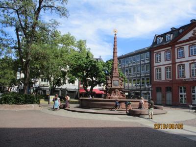 フランクフルト旧市庁舎前のレーマー広場からハウフトヴァッフェへ向けて歩いている途中、見つけました。リープフラウエン教会前の広場に設けられた噴水で、中央に高い塔のようなオブジェがあり、塔の下あたりから、水が出ていました。歴史を感じさせるような大きく、存在感のある噴水でした。