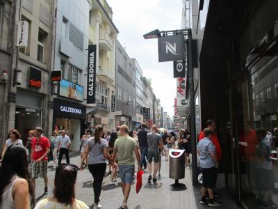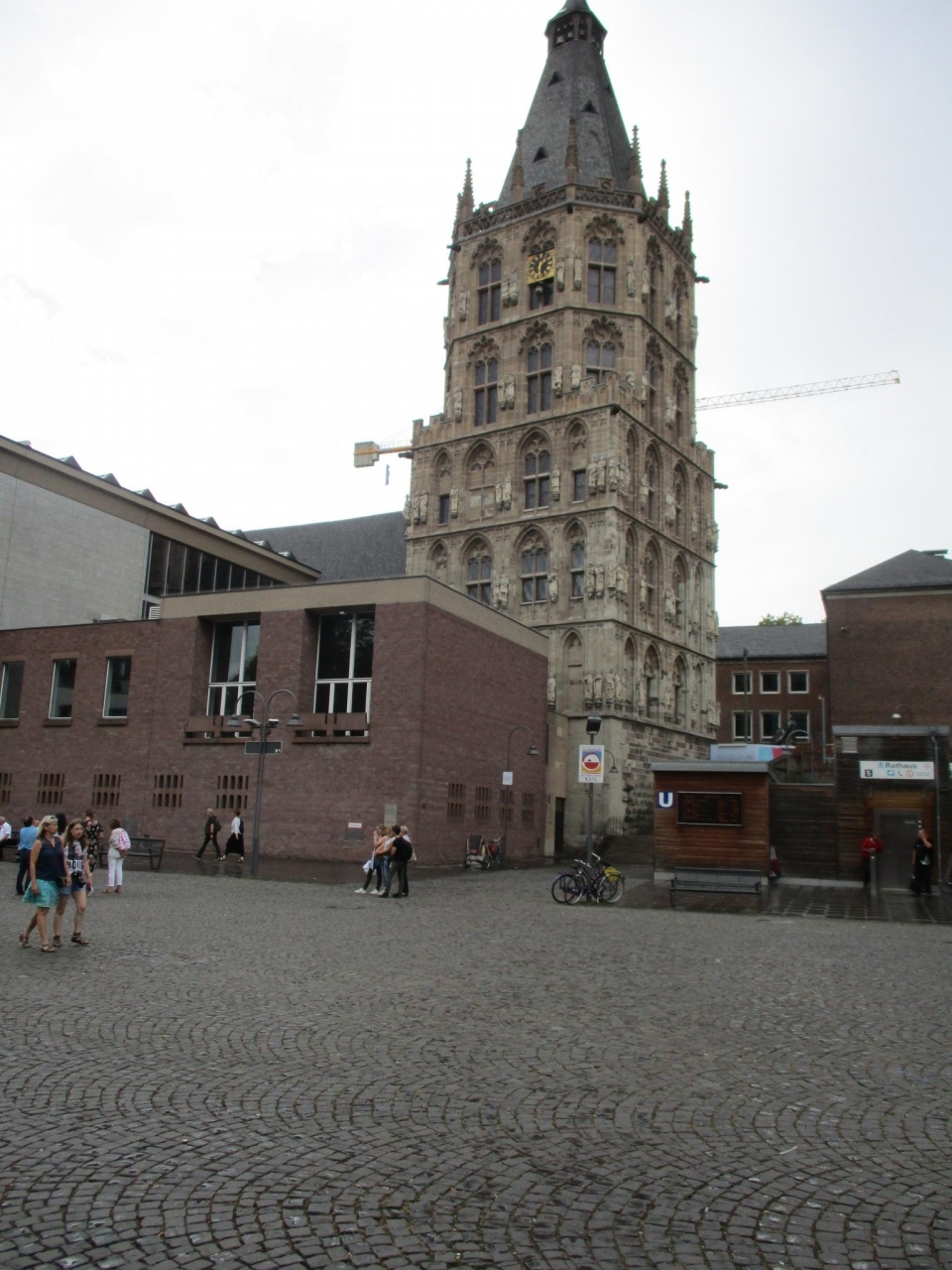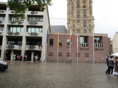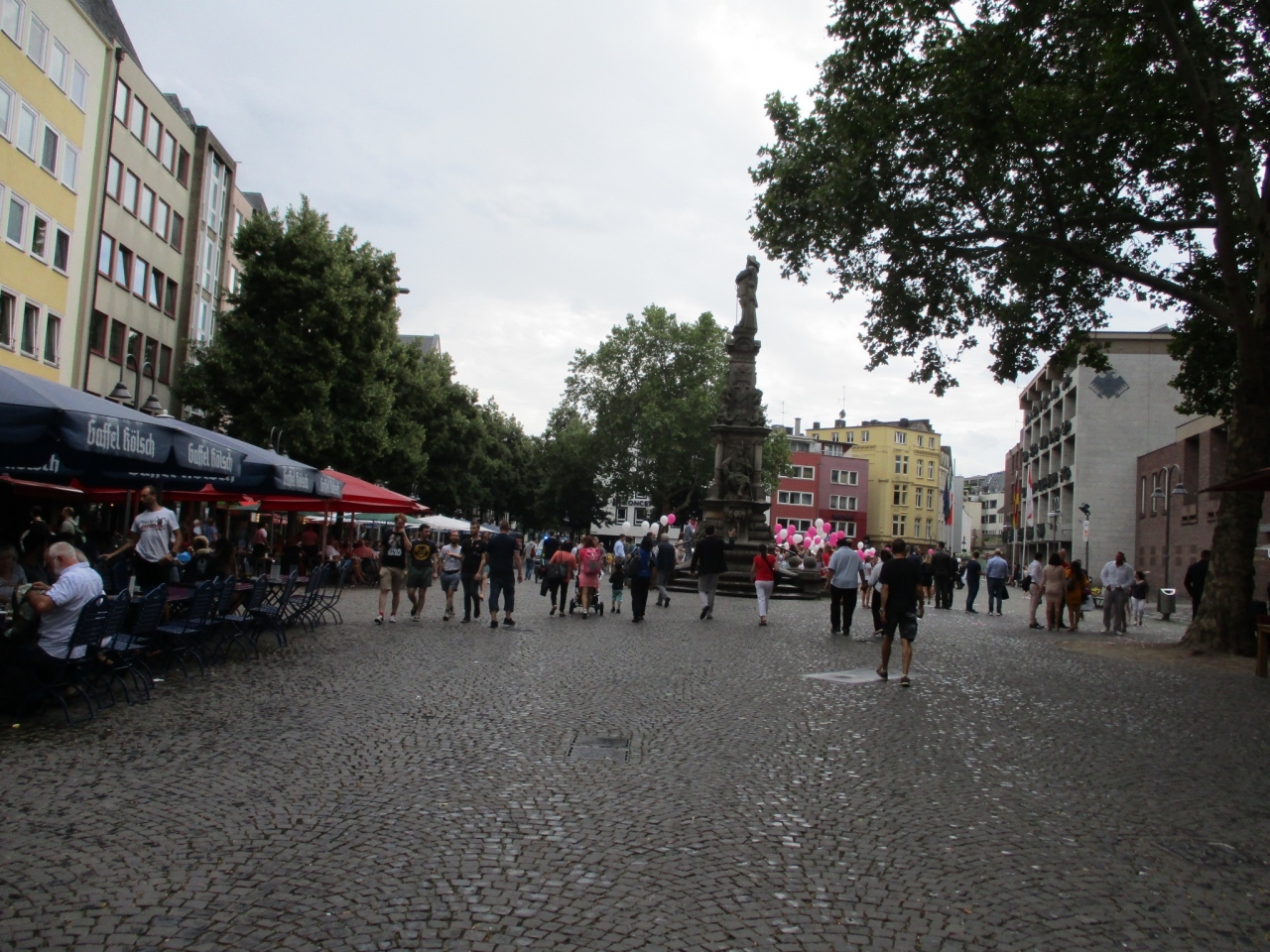 ケルン旧市街ホーエ通りの東側、市庁舎が面する広場です。わりと大きな広場で、周囲は、建物に囲まれており、なかほどに大きな噴水があります。また、ところどころにカフェのテラス席が設けられ、飲み物を手にした人たちがくつろいでいました。