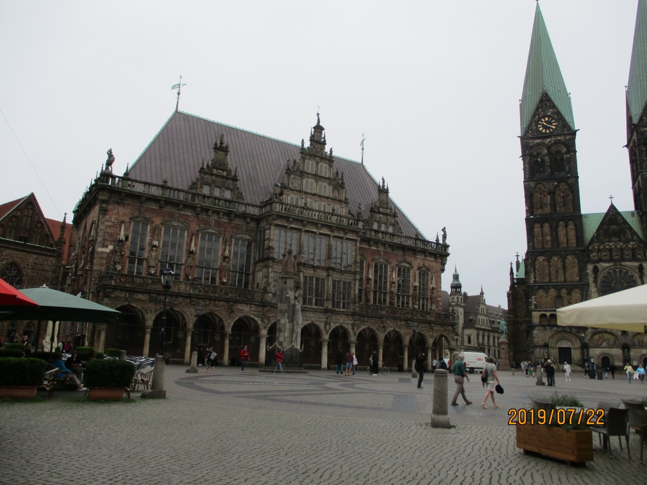 ブレーメン旧市街の中心部、マルクト広場のすみに大きなローラント像がたっています。この像は、自由と権利を象徴するものだそうで、領主の支配を受けなかったハンザ同盟都市ブレーメンを象徴するものです。トラムの走る通りを挟んだ向かいに市庁舎があります。約600年前に建てられた重厚な建物で、歴史の重みを感じさせます。