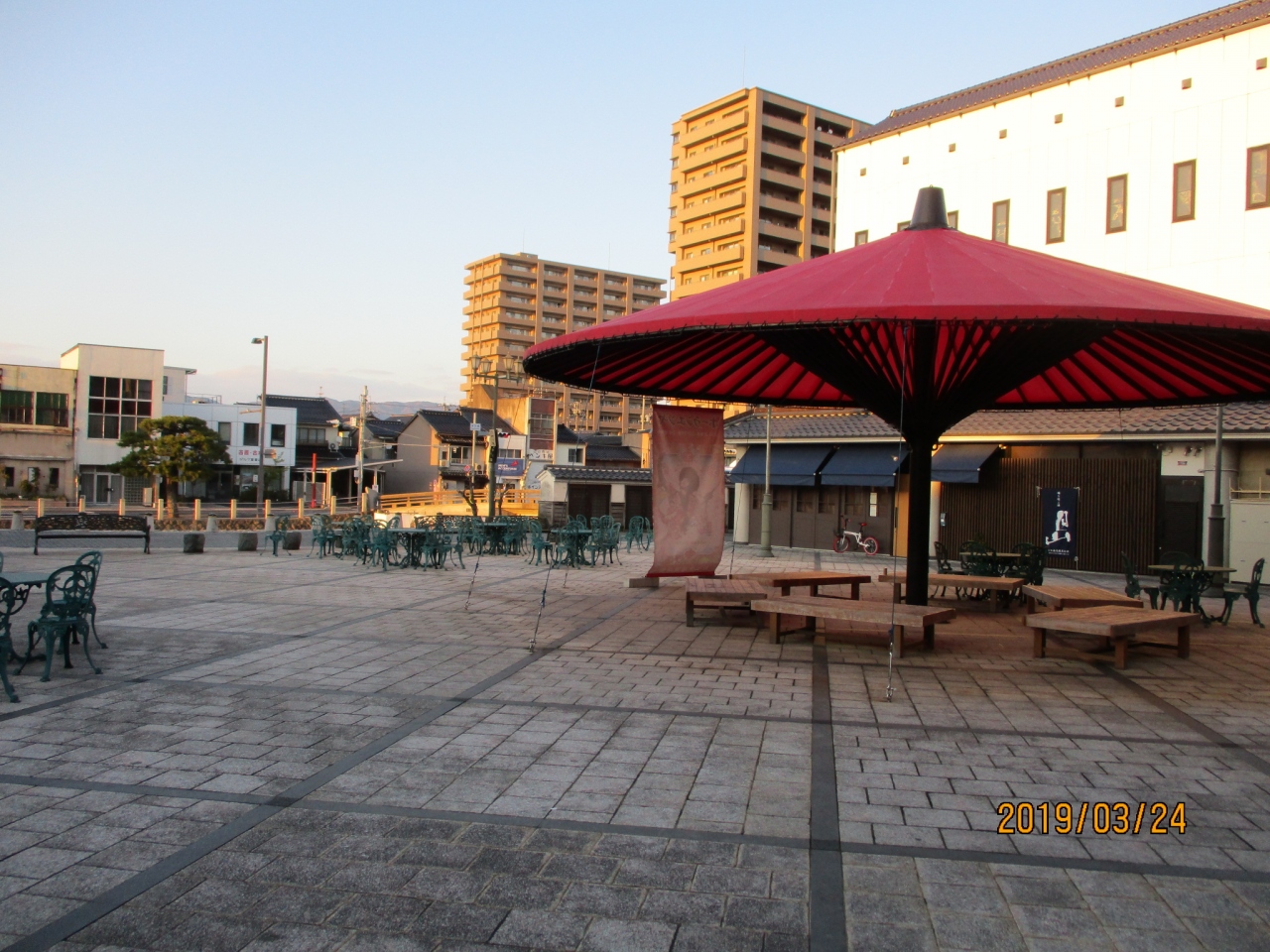 松江京店通り沿いのカラコロ大黒の前を少し入ったところにある広場です。それほど大きな広場ではありませんが、広場のシンボルともいえる大きな赤い傘の下にベンチなどが置かれています。また、京橋川沿いは、堀川めぐりの遊覧船のリばになっているようです。