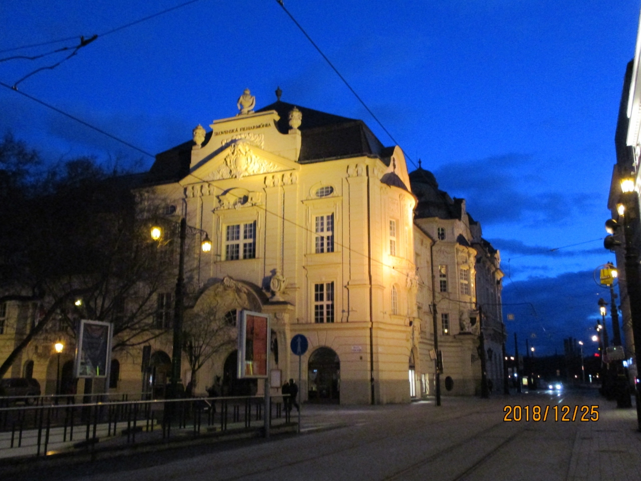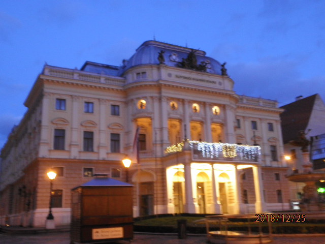 ブラチスラヴァ旧市街のいっかくにたつ劇場です。近くには、スロヴァキア交響楽団の本拠地となっているコンサートホールや公園もあり、ブラチスラヴァの文化ゾーンを形成しています。前には噴水があり、とても美しい建物でした。