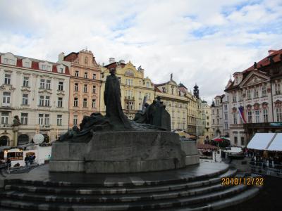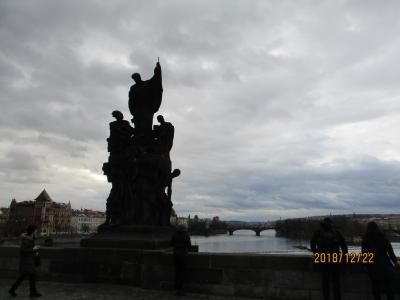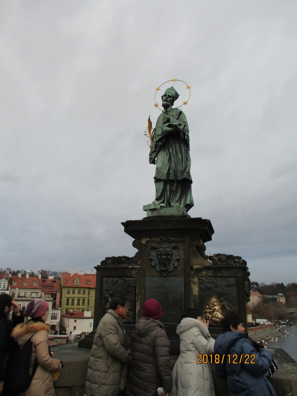 ヴルタヴァ川にかかるカレル橋の上には、多くの聖人像がたち、その中で最初にたてられたのが、このヤン・ネポムツキー像です。ヴァーツラフ4世によって処刑され、その後、ヴルタヴァ川に投げ入れられたと、言われています。この像の台座のレリーフに触ると幸運が訪れるといわれ、多くの観光客がそれに触れていきます。そのため、台座のレリーフは光っています。