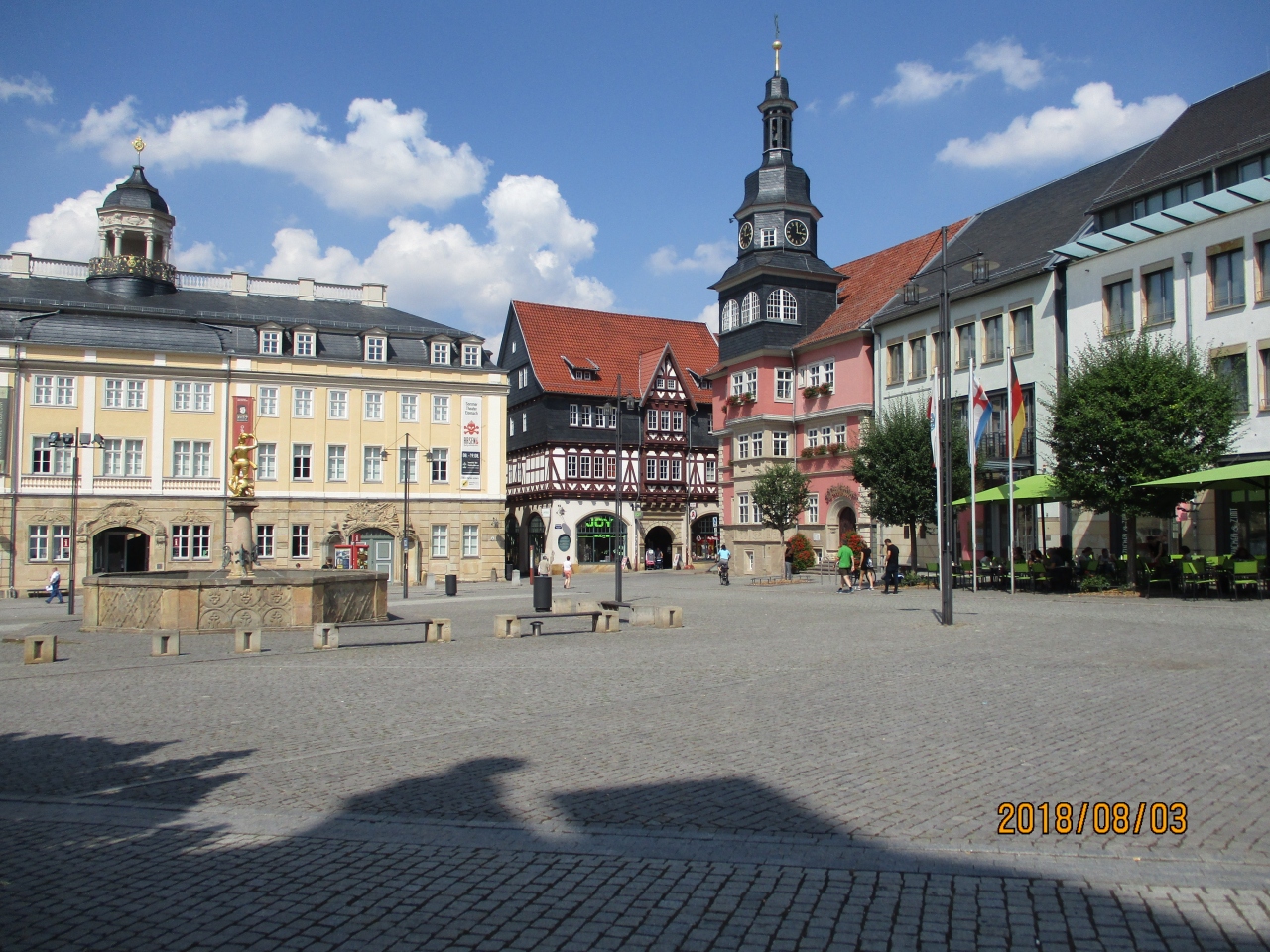 アイゼナハ旧市街のカールス広場から、歩行者通りとなっているカール通りを進んでいくと、マルクト広場にでます。正面には、高さ62メートルの塔をもつゲオルク教会が建ち、広場の周りには、市庁舎やツーリストインフォメーションなどもあり、まさにアイゼナハ旧市街の中心といえます。