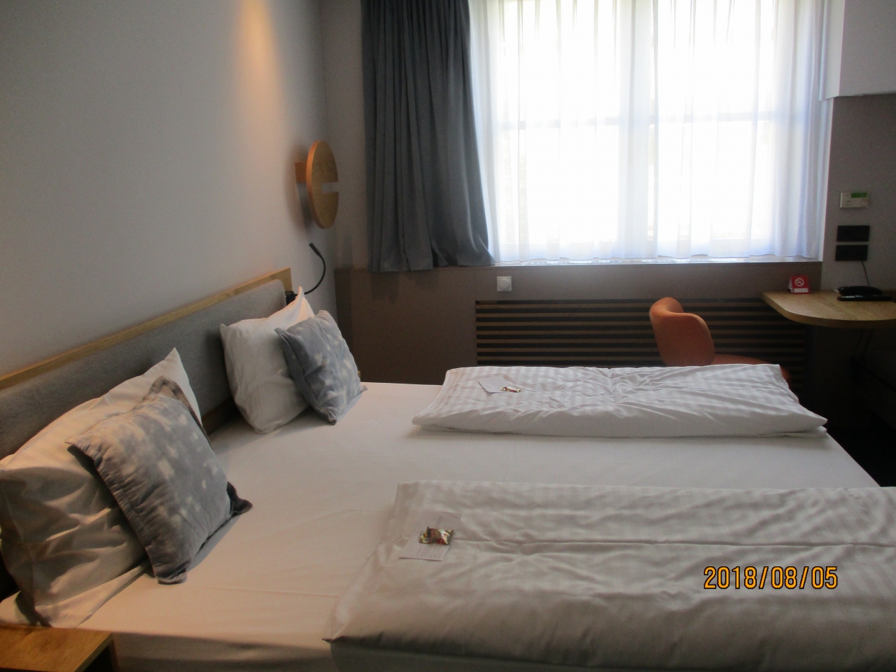 フランクフルト中央駅の北側、徒歩約3分くらいのところに建っています。客室はそれほど広くありませんが、エアコン、セーフティーボックス、冷蔵庫のすべてがそろっています。リーズナブルな料金で利用することができ、朝食も品数豊富でおいしかったです。