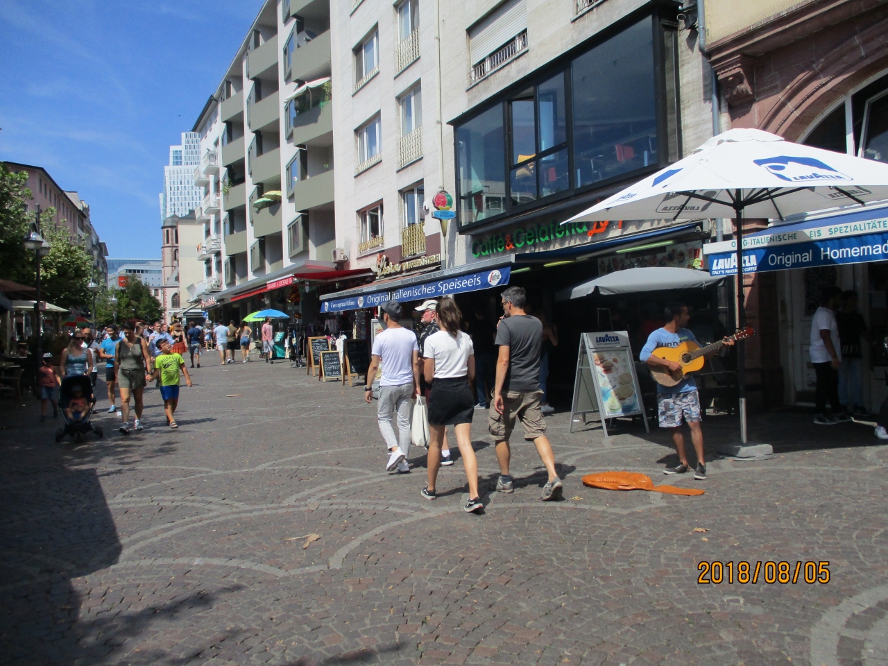 フランクフルト旧市庁舎前のレーマー広場から北へ延びる小路です。この道はまた、リープフラウエン通りを通って、ハウフトヴァッフェ方面へ通じているため、とても人通りが多く、にぎやかです。道沿いには、カフェやレストランがならび、多くの人がテラス席で飲み物などを楽しんでいました。