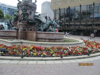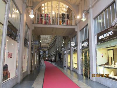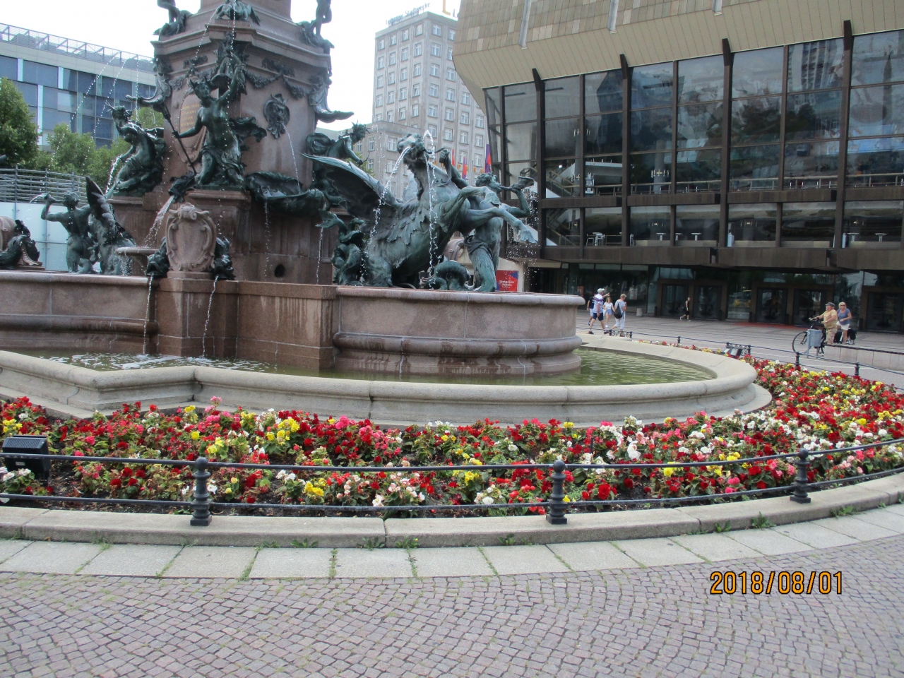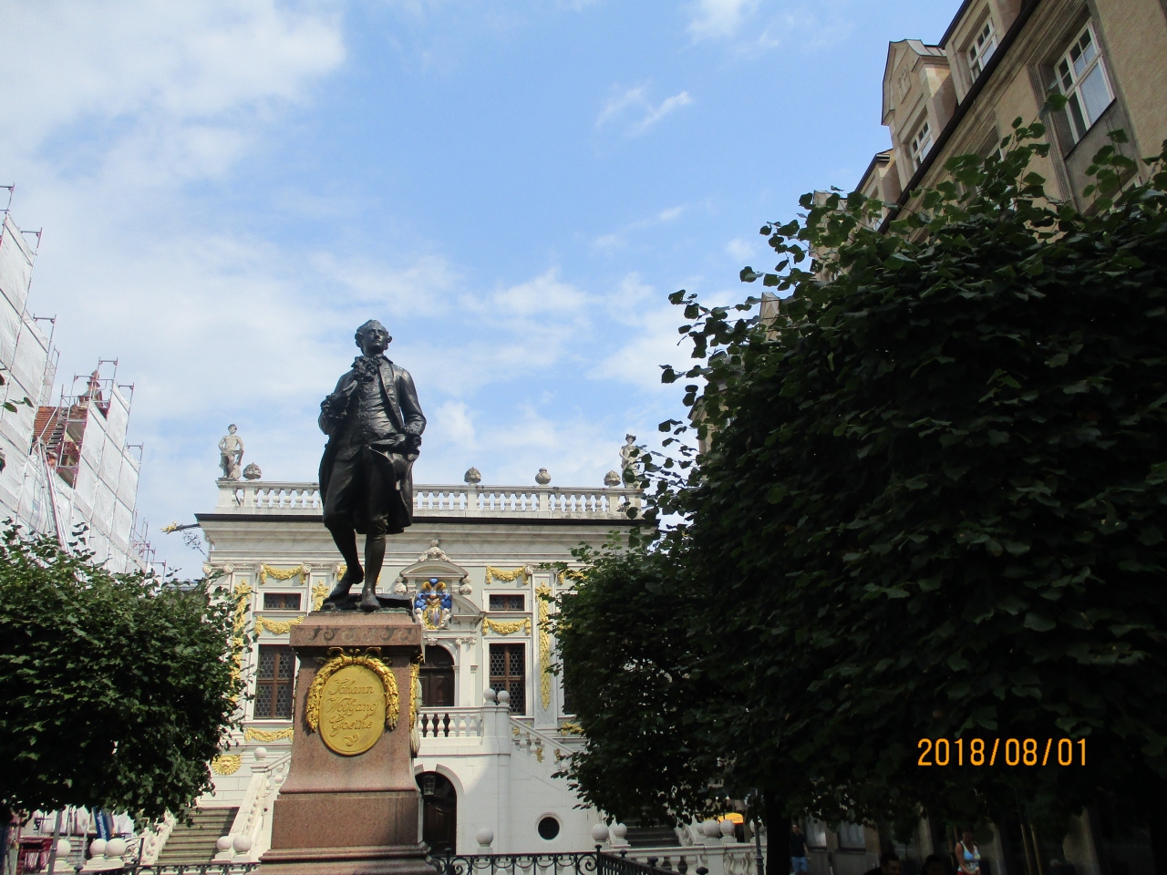 ライプチヒ旧市街のマルクト広場から東へ少し離れたところにあるアーケード街です。通りの中央が赤く着色されとてもよく目立つとともに、レトロな雰囲気がただよっています。このアーケード街の地下にある「アウアーバッハスケラー」は、ゲーテがよく通い、作品『ファウスト』にも登場する酒場で、観光名所にもなっており、16世紀から営業を続けているそうです。