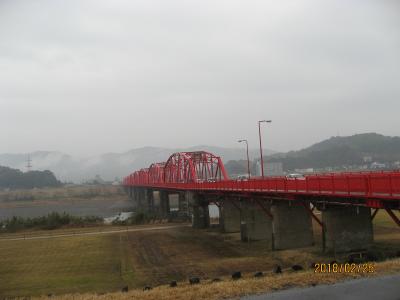 四万十川の下流、右岸と左岸を結ぶ交通量の多い橋です。これより上流にいくつもの沈下橋があり、車の通行が可能なものもありましたが、沈下橋を渡る車は、ごく少数でした。しかしここは、車がひっきりなしに往来する橋となっています。鉄橋全体が赤く塗られ、赤鉄橋と呼ばれています。
